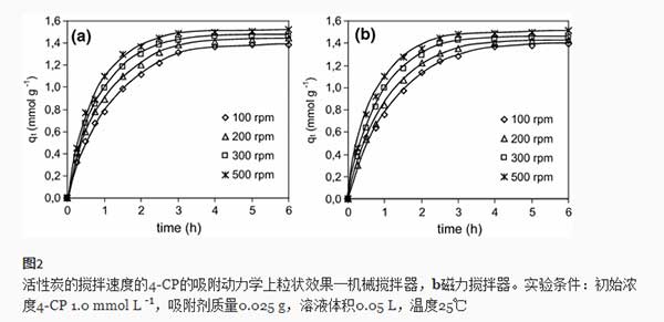 表1中的數(shù)據(jù) 也表明,攪拌速率不僅影響吸附動(dòng)力學(xué),而且影響4-CP從水中的去除效率。吸附容量從1.385增加到1.520 mmol·g -1(機(jī)械攪拌器)和從1.391增加到1.510 mmol·g -1(磁力攪拌器),攪拌速度從100增加到500rpm。觀察到從20.06 4-CP的吸附容量的增加至23.04毫克克-1攪拌速度從300到600轉(zhuǎn)。然而,一些作者已報(bào)道,用增加攪拌速度只能達(dá)到一定的限度,超過此有在吸附容量無顯著增加吸附增加。在一些情況下,觀察到在更高的攪拌速率在吸附容量的降低。正如作者所提出的,這是由于這樣一個(gè)事實(shí),即在非常高的攪拌速度下,吸附分子和吸附劑顆粒的動(dòng)能增加到足以使它們相互碰撞而導(dǎo)致分離松散結(jié)合的吸附分子。