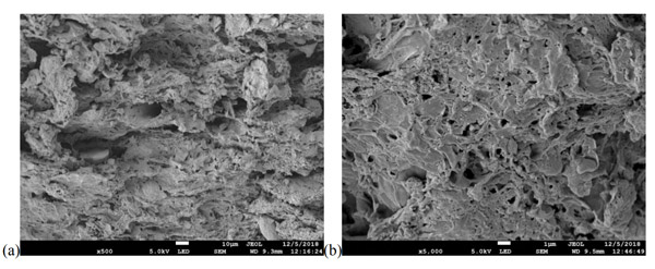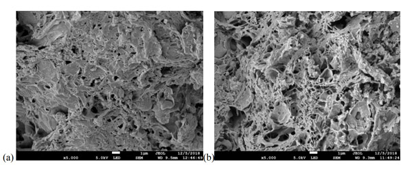 根據(jù)觀察到的活性炭微觀結(jié)構(gòu)來進行形態(tài)研究。圖1顯示了在650°C(a)和850°C(b)兩種不同溫度下用25%H3PO4制成的活性炭的比較?梢钥闯,與650℃相比,在850℃下制備的活性炭具有稍大的孔。可以得知孔體積隨著活化溫度的升高而逐漸增加。