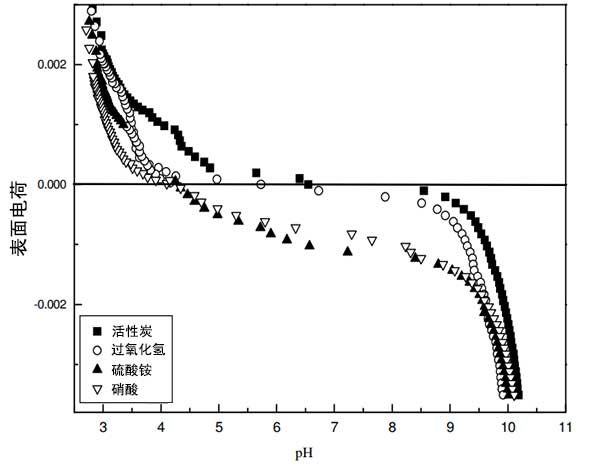 選擇用于改性活性炭表面的試劑都是氧化劑,目的是增加表面官能團的密度。從改性活性炭的化學(xué)表征結(jié)果可以看出,該任務(wù)成功實現(xiàn)。從圖1中可以看出,從活性炭和幾種氧化的活性炭動的酸度以相同的順序增加。酸度增加是由于存在羧基,酚類等酸性基團。