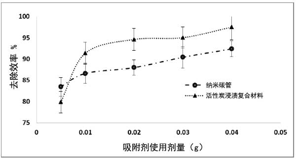 活性炭的用量是一個重要的因素,在吸附過程中起著巨大的作用。為了確定吸附劑的理想劑量,納米碳管和活性炭浸漬材料的用量從0.005到0.04g不等。圖2顯示了去除百分比(%)和不同劑量的納米碳管和活性炭浸漬材料。觀察到吸附在單位重量吸附劑上的染料量從0.005增加到0.04克。在0.04g處觀察到最大去除率,活性炭浸漬材料和納米碳管的百分比分別為97.5%和92.3%。因此,可以推斷吸附量的增加增強了活性紅的去除。顏色去除百分比的增加是由于隨著吸附劑材料的用量而增加,存在較大的表面積,這反過來又會增加反應性空吸附位點的產(chǎn)生,使其更容易并增加離子相互作用。這些位點有利于活性紅溶質(zhì)轉(zhuǎn)移到吸附劑的外表面并提高其消除率。