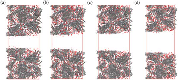 活性炭由微孔和介孔組成,介孔在一定程度上影響吸附特性。因此,研究芳烴在具有分級孔的活性炭上的吸附特性,以明確介孔對下一節(jié)吸附特性的影響。在這些模擬中,選擇了密度為0.8g/cm3的微孔活性炭,不同樣品的中孔尺寸分別選擇為2.0、2.5、3.0和4.0nm。具有不同層次孔隙的活性炭。分層孔隙活性炭模型構(gòu)建為密度在0.6-0.7g/cm3的合理范圍內(nèi)。圖3展示了苯分子在p=10kPa下具有不同中尺度孔徑的活性炭上的吸附位點分布。這表明即使在p=10kPa時,苯的吸附也僅發(fā)生在介孔表面,而不會填充介孔的空隙空間。圖4說明了對二甲苯在具有3.0nm孔的活性炭上從低壓到高壓的吸附位點的變化。從圖4(a)-(d)可以看出,只有微量的對二甲苯分子被吸附到微孔上,當(dāng)壓力為1.25kPa時,微孔逐漸被填滿,中孔壁上出現(xiàn)吸附位點。當(dāng)壓力增加到3.75kPa時,吸附位點增加,介孔中開始出現(xiàn)多層吸附,最終介孔充滿對二甲苯,此時壓力可達(dá)6.25kPa。