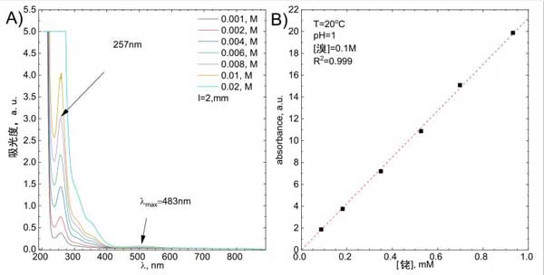 圖1:(A)研究溶液的UV-Vis光譜作為銠初始濃度的函數(shù),(B)使用圖形方法測定摩爾吸收系數(shù)。