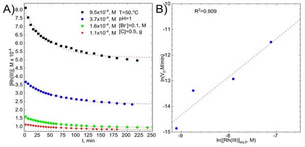 很明顯,銠溴化物絡(luò)離子的初始濃度將影響它們在電解質(zhì)中的平衡濃度和吸附過程的速率。這是圖2A,其中繪制了在T=50℃下在攪拌溶液中獲得的動(dòng)力學(xué)曲線,攪拌速率為1200rpm。得到離子之間的線性相關(guān)性,確定系數(shù)接近圖2B。擬合線的斜率等于1.48±0.33,證實(shí)了初始假設(shè),即關(guān)于銠溴化物絡(luò)離子初始濃度的反應(yīng)的第一級。吸附動(dòng)力學(xué)還應(yīng)取決于活性炭的表面積,前提是系統(tǒng)不受擴(kuò)散控制。這已針對不同濃度的吸附劑進(jìn)行了驗(yàn)證。