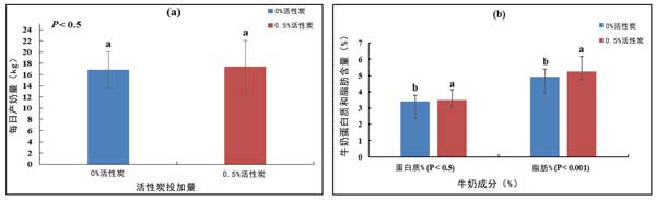 圖2:(a)活性炭對每日產(chǎn)奶量(kg)的影響,(b)乳蛋白和脂肪(%)。