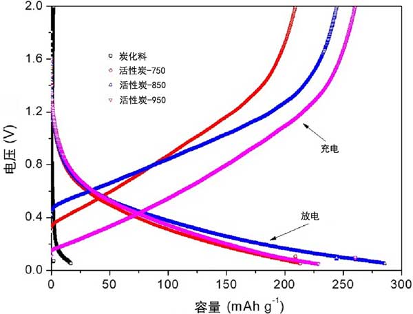 充放電曲線評(píng)估了活性炭的的電化學(xué)性能,不同溫度活化的活性炭電極如圖3所示。CD測(cè)試是在0.25C的電流密度速率下進(jìn)行的;罨瘻囟忍岣吡顺潆娙萘。活性炭樣品的高充電容量為260.36mAh/g-1,而炭化料樣品的低充電容量為1.98mAh/g-1。這是因?yàn)榛罨臉悠房梢晕蘸芏嗟匿囯x子。放電曲線顯示三個(gè)不同的電位區(qū)域,這可能歸因于不同的機(jī)制。0到0.12V的區(qū)域?qū)?yīng)于鋰離子從隨機(jī)取向的小分子堆疊中的微孔中脫出。0.12到0.8V的區(qū)域歸因于鋰離子從無序石墨烯層中脫出。高于0.8V的區(qū)域?qū)?yīng)于鋰從各種邊緣位置或石墨烯層中含H-/O官能團(tuán)的脫嵌。