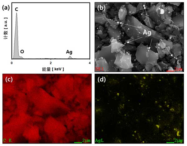 圖2:活性炭載銀復合材料的FE-SEM和EDS分析結果:(a)EDS光譜,(b)FE-SEM實像和(c)碳元素映射圖,(d)Ag元素映射圖像。