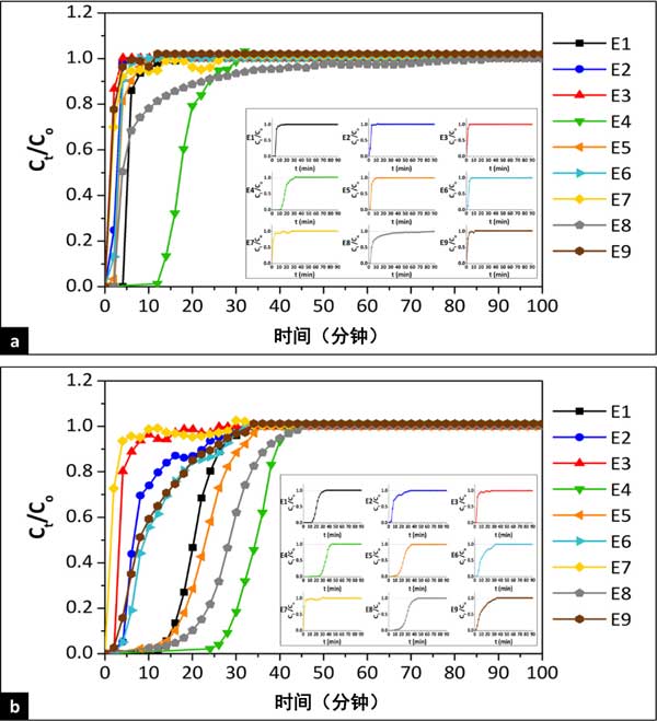 圖2:使用活性炭吸附(a)環(huán)己烷和(b)苯的突破曲線(xiàn)。