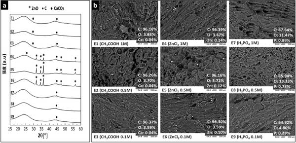 活性炭的X射線(xiàn)衍射圖如圖1-a所示。峰值在2θ=44在所有衍射圖中觀(guān)察到的6°歸因于對(duì)應(yīng)于石墨(00-001-0646)的(101)平面。與其他材料不同,活性炭的衍射圖也顯示在2θ=26.4°歸因于石墨(00-001-0646)的(002)平面。ZnO和CaCO3可能是在熱處理過(guò)程中作為原材料組分和活化劑之間二次化學(xué)反應(yīng)的產(chǎn)物或由于前體中固有的殘留礦物質(zhì)含量而產(chǎn)生的。經(jīng)過(guò)掃描電鏡分析500倍的SEM顯微照片如圖1-b所示。觀(guān)察到所有活性炭都表現(xiàn)出異質(zhì)表面形態(tài),其由不規(guī)則形式的成組薄片組成。在用ZnCl2活化的碳的表面上觀(guān)察到與氧化鋅相對(duì)應(yīng)的沒(méi)有特定形狀的白色小顆粒(通過(guò)XRPD分析證實(shí))。此外,EDS分析顯示存在分散在整個(gè)表面的碳(C)、氧(O)和鋅(Zn),從而證實(shí)了ZnO顆粒分散在這些吸附劑的表面上。