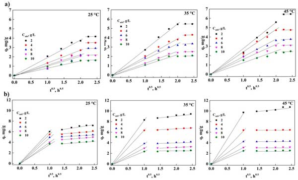 外部和粒子內(nèi)傳質(zhì)過程的分析可以對3,5-二硝基水楊酸的吸附產(chǎn)生顯著影響,在去除3,5-二硝基水楊酸時可能存在由于物質(zhì)傳輸造成的限制,這有必要對這種現(xiàn)象進行分析。圖2a是以外擴散模型為基礎(chǔ)構(gòu)建的,從中可以看出,對于活性炭,在吸附過程中接觸長達6小時的實驗點處存在一條直線,這表明存在以下可能性,在任何溫度的過程中通過外部傳質(zhì)控制。圖2b顯示了粉末活性炭在3,5-二硝基水楊酸吸附中獲得的實驗數(shù)據(jù)的表示,其中在與吸附劑接觸1小時時觀察到一條直線。這表明使用活性炭粒子不存在外部傳質(zhì)問題,因為3,5-二硝基水楊酸會迅速從溶液中去除,擴散到表面。此外,這表明活性炭顆粒中的吸附過程可能是由于表面存在的官能團。根據(jù)這些結(jié)果,確定是否也存在內(nèi)部傳質(zhì)問題很重要,從而能夠確定3,5-二硝基水楊酸刪除過程是否受到這種現(xiàn)象的存在的顯著影響。