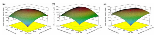 圖1:碘吸附能力的3D表面模型圖(a)活化時間和活化溫度,(b)炭與水的質(zhì)量比和活化溫度,(c)炭與水的質(zhì)量比和活化時間。