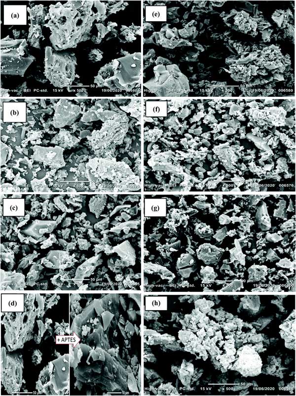 材料的SEM圖像在圖1中給出;钚蕴烤哂胁痪鶆虻墓饣砻妫郊s為50μm(圖1a)。在用硝酸和過氧化氫進(jìn)行氧化處理后,氧物質(zhì)(羧基和硝酸鹽基團(tuán))被接枝,導(dǎo)致活性炭-OH的表面比活性炭更粗糙(圖1e)。通過APTES處理接枝氨基硅烷是成功的:活性炭-APTES和活性炭-OH-APTES表面分別比活性炭和活性炭-OH更光滑(圖1d和f)。裂縫和不均勻的空腔可用作氟化物的吸附位點(diǎn)。存在的粗糙表面和大量白色顆粒證實(shí)了Al顆粒的添加(圖2c、g和h)。這些白色顆粒可以對應(yīng)于結(jié)合到材料表面的不同形狀和尺寸的Al納米顆粒的不同簇。