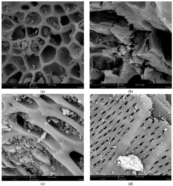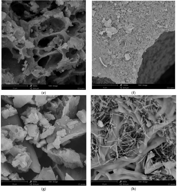 在溶劑加載之前的活性炭通過使用掃描電子顯微鏡作為SEM顯微照片進行表征(圖1)。分析表明,不僅研究不同材質(zhì)活性炭彼此的不同,而且在一種材料中也可能出現(xiàn)不同的結(jié)構(gòu)(圖1a與圖1b、圖1c與圖1d、圖1e與圖1f和圖1g與圖1h)。所有的材料都不是均質(zhì)的,在所有的原材料中,都可以發(fā)現(xiàn)具有不同孔隙率的顆粒、壓實的塊狀,甚至是纖維結(jié)構(gòu)。材料C1(粒徑0.5÷0.75mm的活性炭)是高度多孔的,顆粒充滿可見孔,直徑為5÷11µm,壁光滑(圖1a),顆粒結(jié)構(gòu)的壁密度較低,但也有很大的表面積(圖1b)。粉狀活性炭(C2)具有較小的(圖1d)和較大的(圖1c)孔,具有光滑(圖1c)和較粗糙(圖1d)的壁和細長的形狀。這兩種材料似乎都具有良好的孔隙率和表面,因此它們應該是非常有效的吸附劑。我們的結(jié)果證實,C1和C2在鉭的去除方面都非常有效,去除效率約為97%。C3的多孔性要小得多。雖然有一些顆粒具有相對較高的孔隙(圖1e),但也有較高含量的更致密、相當無孔的塊狀(圖1f)?紫督Y(jié)構(gòu)受到輕微干擾,可能是由植物材料中可能存在的無機化合物晶體造成的(圖1e)。因此,這種結(jié)構(gòu)表明較低的表面和吸附特性。然而,無孔件的表面積似乎很發(fā)達(圖1f)。這是相當虛幻的,因為在使用的所有活性炭中,材料C3的鉭去除效率最低(81%)。最小的大孔材料似乎是C4炭。它由具有緊湊結(jié)構(gòu)的塊(圖1g)和類似于納米管或纖維結(jié)構(gòu)的形式(圖1h)組成。這種材料的多孔性也比C1和C2少,但由于纖維的原因,它的表面應該比C3更發(fā)達,因此它應該具有更好的吸附效率。事實上,這種材料的鉭去除效率略高于C3,但仍低于活性炭C1和C2。根據(jù)這些結(jié)果,可以得出結(jié)論,C1和C2的原材料就具有大孔結(jié)構(gòu)。