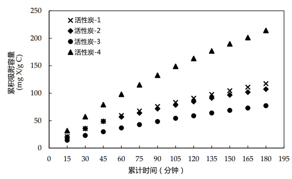 活性炭是去除有機(jī)物的常用吸附劑。吸附性能主要取決于其比表面積和微孔結(jié)構(gòu)。它們具有較高的內(nèi)部孔隙率,因此具有較高的吸附性。在本研究中,對(duì)四種具有不同表面性質(zhì)的顆粒活性炭樣品(活性炭-1、2、3和4)進(jìn)行了去除黃藥的測(cè)試。將兩克活性炭樣品與50毫升1590毫克/升的黃藥溶液混合15分鐘。過(guò)濾活性炭,并用紫外-可見(jiàn)光譜法測(cè)量溶液中的殘余黃藥。通過(guò)重復(fù)使用碳樣品,重復(fù)該程序12次,以達(dá)到大吸附量。如圖1所示,活性炭-4的吸附容量比較高,因此選擇其進(jìn)行進(jìn)一步研究。
