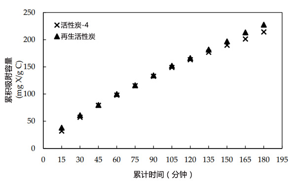 活性炭具有一定的吸附能力。隨著越來(lái)越多的成分被吸附在其表面上,吸附能力會(huì)隨著時(shí)間的推移而降低。一旦達(dá)到最大吸附容量,就不能再有效使用。對(duì)于活性炭樣品的再生,吸附的成分可以通過(guò)加熱破壞。在這部分研究中,在其表面吸附黃原酸鹽的廢活性炭樣品通過(guò)在550℃下加熱1小時(shí)進(jìn)行再生。圖2比較了初始活性炭和再生活性炭樣品的吸附性能。再生活性炭和活性炭樣品的累積吸附黃藥量相差不大。結(jié)果表明,吸附在用過(guò)的活性炭上的黃藥被破壞了,它被有效地恢復(fù)并可以重復(fù)使用。