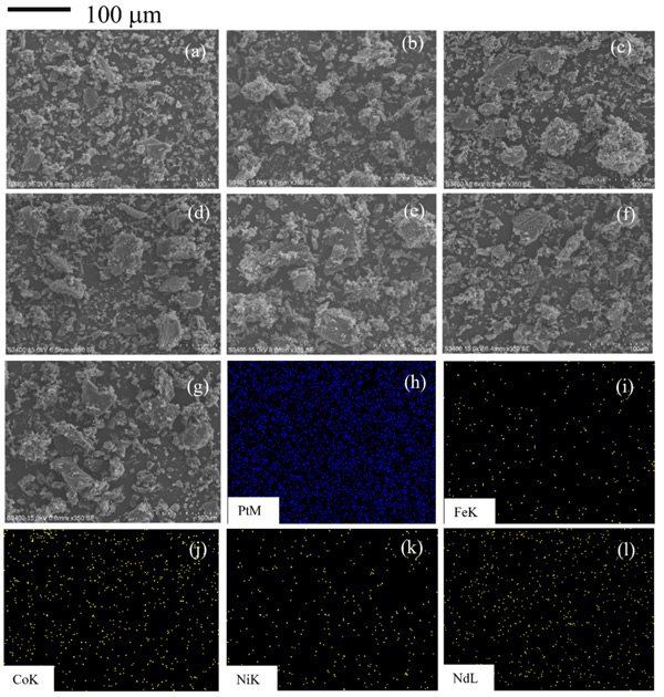 圖1:(a)載鉑活性炭,(b)載鐵鉑活性炭,(c)載磁鐵,(d)載磁鐵鉑,(e)載鈷鉑,(f)載鎳鉑的SEM照片和(g)載釹鉑活性炭催化劑以及(h)鉑、(i)鐵、(j)鈷、(k)鎳和(l)釹在活性炭上的相應元素映射圖像。