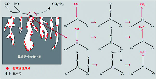 在活性炭催化劑表面通過選擇性催化還原技術(shù)(CO-SCR)反應(yīng)進行的低溫脫硝是一種具有代表性的非均相催化體系,遵循Langmuir-Hinshelwood反應(yīng)機理。因此,提出了圖3所示的脫硝機制,用于在活性炭催化劑上對NO進行CO還原;钚越M分Cu均勻分散在活性炭上,增加了催化劑的比表面積和對NO和CO的吸附。這一結(jié)論表明Cu均勻分布在活性炭催化劑的表面,將脫硝效率提高到80%。CO吸附在催化劑表面以還原-O-Cu2+到=Cu+并生成CO2。吸附的NO解離成N和O,解離的N原子與NO分子結(jié)合形成N2O。據(jù)報道,NO的解離是CO誘導(dǎo)的NO消除的關(guān)鍵步驟;钚晕稽c的釋放促進了CO的吸附,最后N2O和=Cu+反應(yīng)生成N2和–O–Cu2+,這進一步促進了脫硝反應(yīng)。在CO與NO的反應(yīng)中,Cu2+↔Cu+交換可能會改變催化劑表面的價態(tài),更多的氧空位可用于轉(zhuǎn)化過程,促進NO向N2的轉(zhuǎn)化。