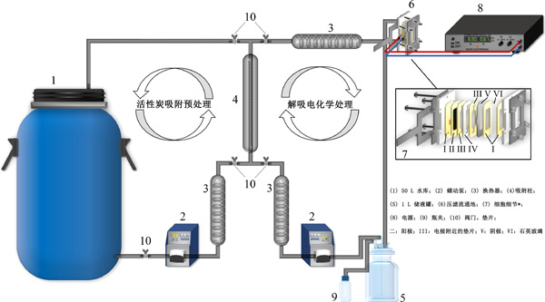制備含有300mg/L-1苯的甲醇溶液和含有50mmol/L-1電解質(zhì)(H2SO4)的水介質(zhì),以確定污染物的去除效率。初始pH值約為1.5,在電化學(xué)過程測(cè)試期間未觀察到顯著變化。使用包含電極作為陽(yáng)極和鈦板作為陰極的單隔室壓濾流動(dòng)池(在圖1中詳細(xì)表示)進(jìn)行電解,其具有13.5cm2的明顯幾何面積。兩個(gè)電極由墊片隔開,距離為4毫米。使用含有1L溶液的夾套玻璃容器,蠕動(dòng)泵以1L/min-1的速度將溶液泵入熱交換器,然后循環(huán)通過電池。使用恒溫浴將溫度控制在25℃。在恒電流模式下以50mA/cm-2的電流密度進(jìn)行電解。使用前,將陽(yáng)極在H 2 SO4/0.05mol/L-1溶液中以40mA/cm-2極化20分鐘, 以從其表面去除任何雜質(zhì)。電化學(xué)實(shí)驗(yàn)一式三份進(jìn)行。