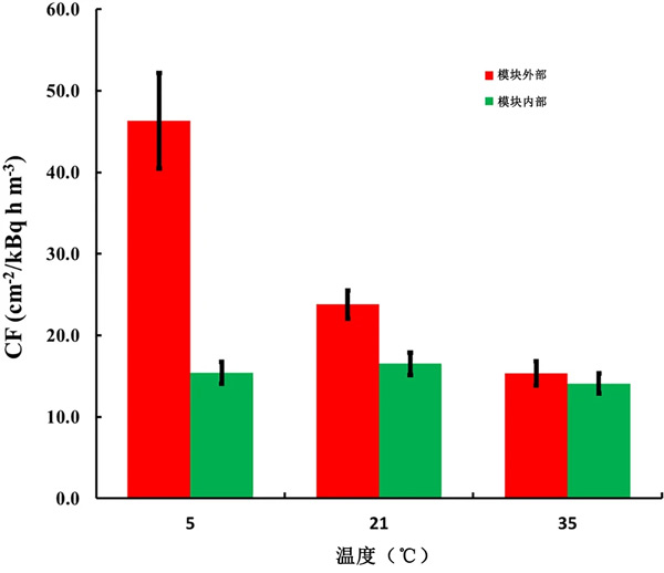 對于實驗,使用三種活性炭的織物為探測器設(shè)計了單獨的模塊。對于前兩種活性炭,模塊是HDPE,對于第三種活性炭,模塊是LDPE。單獨設(shè)計遵循上述方法,考慮到每種活性炭織物的確切單獨質(zhì)量。在所有設(shè)計中,不同溫度下的k(T)值根據(jù)方程式計算;钚蕴康慕Y(jié)果如圖2所示。5℃時的CF0比35℃時的CF0高305%。相比之下,對于放置在補償模塊中的傳感器,CF的變化在17%以內(nèi)(最大值/最小值=1.17)。值得注意的是,在模塊內(nèi)部不同溫度下暴露的傳感器的CF之間的配差異在95%的顯著性水平上沒有統(tǒng)計學(xué)意義。發(fā)現(xiàn)所描述的帶有補償模塊的探測器的CF明顯高于其他常用的無源氡探測器。
