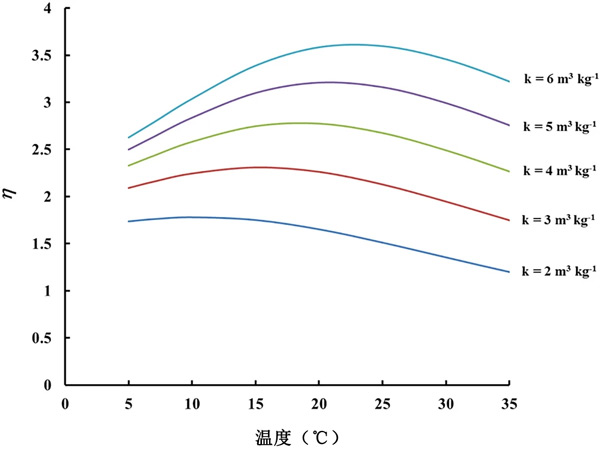 查看活性炭的檢測器的結(jié)果(圖2)可以看出,相同溫度下的CF0在活性炭之間存在差異。這意味著不同活性炭的吸附能力存在一些差異。在所有模塊設(shè)計中,假設(shè)21℃下的吸附容量值為4m3/kg-1。然而,由于我們的實驗結(jié)果表明不同活性炭材料的k可能存在差異。不同k值的結(jié)果如圖3所示?梢钥闯觯瑢τ趨^(qū)間2-6m3/kg-1內(nèi)的所有k值,η的變化(例如最大/最小比率)與溫度的變化遠(yuǎn)小于未包裝傳感器觀察到的230-305%的變化。