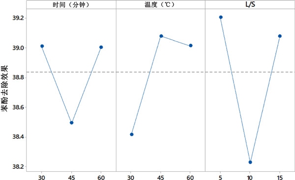 田口法用于優(yōu)化參數(shù),即時(shí)間、溫度和L/S,這些參數(shù)直接取決于苯酚的去除。選擇田口方法的選項(xiàng)越大越好。本研究的主要目的是活性炭從廢水中去除較多的苯酚,因此選擇了越大越好的選項(xiàng)。此外,采用添加劑模型來確定各個(gè)輸入?yún)?shù)對(duì)去除苯酚濃度的影響。這種分析稱為因子效應(yīng)的確定,結(jié)果見圖2。