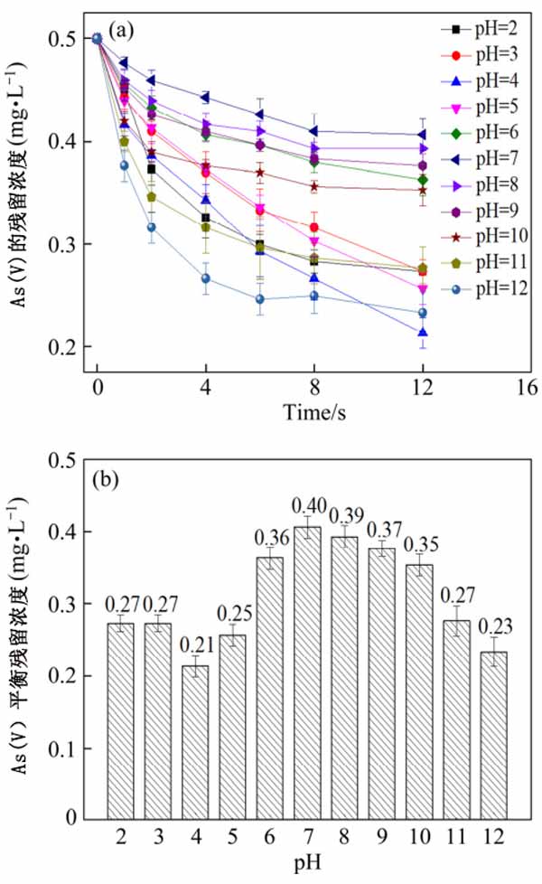 圖2:pH對(duì)As(V)電吸附的影響(a)As(V)的殘留濃度,(b)As(V)的平衡濃度。