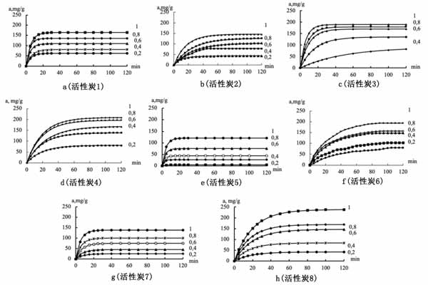 實驗發(fā)現(xiàn)即使在成分指標、技術(shù)特征和處理來自不同地理形成地點的相同類型廢物形式的原材料的條件下,活性炭吸附劑的產(chǎn)率和個體特性也很接近。根據(jù)現(xiàn)有的信息來源,它們并不總是與其最佳樣本相對應。下述實驗數(shù)據(jù)證實了這種情況。然而,它們具有不同的,并且在某些情況下具有高效率,可用于解決從工業(yè)排放物和排放物的有機雜質(zhì)中凈化的廣泛問題。在植物廢物(a)中獲得的活性炭從其VMA中吸附正丁醇蒸氣的動力學曲線在圖1和圖2中進行了比較。
