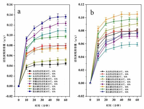 圖2:相同溫度和濕度和不同改性方法下活性炭的靜態(tài)吸附曲線。(a)相同溫度和濕度下不同濃度草酸改性活性炭的水蒸氣靜態(tài)吸附曲線。(b)相同溫度和濕度下不同濃度草酸+酯水解改性活性炭的水蒸氣靜態(tài)吸附曲線。
