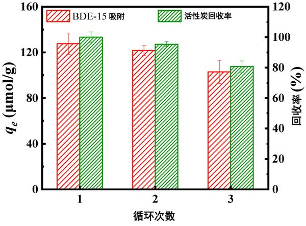 為研究活性炭處理洗脫液后的循環(huán)利用性能,采用甲醇洗脫活性炭進(jìn)行再生回用。如圖3所示,在三個(gè)回收-吸附循環(huán)中,活性炭的吸附量略有下降,活性炭的吸附量保持在103μmol/g以上,下降了25μmol/g(下降了19%);钚蕴勘憩F(xiàn)出良好的可回收性和可重復(fù)使用性,有利于實(shí)際應(yīng)用。