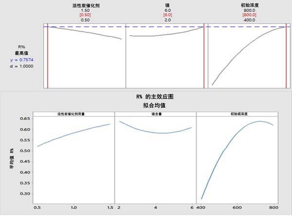 圖2:研究變量對(duì)二苯并噻吩轉(zhuǎn)化率的影響,轉(zhuǎn)化率隨著活性炭催化劑用量和初始硫濃度的增加而增加,隨著Ni負(fù)載量的增加而降低(上圖)。對(duì)于活性炭催化劑用量、Ni負(fù)載量和初始硫濃度,在0.5g、6%和700ppm時(shí),最佳二苯并噻吩轉(zhuǎn)化率分別為75.74%(下圖)。