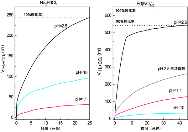 兩種不同的Pd前驅(qū)體在不同浸漬pH下制備的活性炭催化劑在60℃時(shí)產(chǎn)生的重整氣體(H2+CO2)的體積隨時(shí)間的變化曲線圖在圖2顯示。由于甲酸鈉添加劑對(duì)甲酸脫氫的促進(jìn)作用,催化測(cè)試在存在的情況下進(jìn)行]。所有制備的樣品都顯示出研究反應(yīng)的活性。正如在當(dāng)前測(cè)試條件下所預(yù)期的,曲線的形狀遵循甲酸中的一級(jí)動(dòng)力學(xué)。為了更好地理解析氫曲線,我們測(cè)量了不同階段的反應(yīng)pH值:分散催化劑和甲酸鈉在60℃攪拌30分鐘后,注入甲酸后,當(dāng)反應(yīng)開(kāi)始時(shí)和使用Na2PdCl4制備的催化劑系列反應(yīng)25分鐘后和Pd(NO3)2系列反應(yīng)40分鐘后,根據(jù)圖7所示的曲線。表明在所有樣品的反應(yīng)過(guò)程中,甲酸+甲酸鈉緩沖液的初始pH值保持不變,除了使用Pd(NO3)2制備的樣品,在pH值2.5下浸漬并用銻還原。對(duì)于該樣品,反應(yīng)40分鐘后的pH值為8.2,表明緩沖條件的喪失和甲酸的總消耗量與實(shí)現(xiàn)的90%甲酸轉(zhuǎn)化率一致。對(duì)于該系列的其余部分,pH測(cè)量值表明甲酸并未完全消耗,這與實(shí)現(xiàn)的轉(zhuǎn)化率一致。
