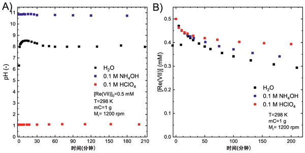 在不同溶液中解吸的動(dòng)力學(xué)曲線。在過(guò)程的初始階段解吸率最高。當(dāng)大約91%的金屬解吸到0.1M/HClO4中時(shí),計(jì)算最終濃度。在這種情況下,錸化合物的再溶解與解吸一起發(fā)生。水的特點(diǎn)是解吸率最低;只有15%的Re被解吸。在0.1M/NH4OH的情況下,3小時(shí)后的最終濃度為0.093mM,38%的Re被解吸。然而,0.1M/NH4中的錸濃度OH在解吸的第一個(gè)小時(shí)內(nèi)增加,之后略有下降。