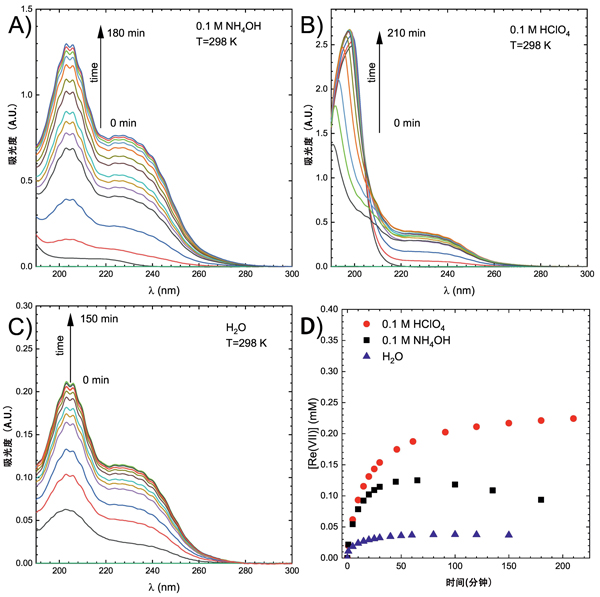 對(duì)于解吸研究,在25℃吸附后,200cm3溶液使用1g活性炭。Re(VII)離子的初始濃度為0.5mM。吸附后,將樣品分成三部分。然后在三種環(huán)境中進(jìn)行解吸,即0.1M/HClO4、0.1M/NH4OH和H2O。在所有情況下,每50cm3液體使用0.3g活性炭。UV-Vis光譜和動(dòng)力學(xué)曲線如圖4。