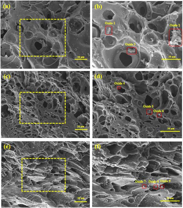 圖1:活性炭載錳催化劑的SEM照片(a)5%×300,(b)5%×500,(c)7%×300,(d)7%×500,(e)9%×300,(f)9%×500。