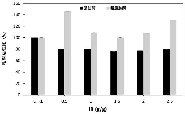 圖3:與游離酶相比,浸漬比(活性炭A3和A6–A9)對兩種固定化脂肪酶(脂肪酶和豬脂肪酶)相對活性的影響。