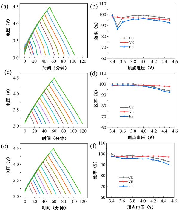 圖1:活性炭鋰半電池在不同鋰離子電解質(zhì)中從pzc到各種頂點電壓的恒電流充放電曲線:(a)EDD,(c)EPD,和(e)PCE;相應的EE、CE和VE值作為頂點電壓的函數(shù):(b)EDD,(d)EPD,和(f)PCE。