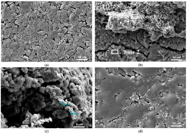 圖3:(a)交流電極和來自活性炭鋰半電池的交流電極的SEM圖像充電到10.0V的高電壓,具有不同的電解質(zhì)(b、c)PCE,(d)EPD。