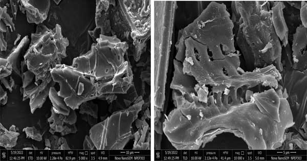 使用掃描電子顯微鏡分析獲得的活性炭的孔結(jié)構(gòu)。SEM設(shè)備具有超高分辨率低電壓成像和獨(dú)特的低真空能力。SEM圖像是在15kV時(shí)以1nm、1kV時(shí)1.4nm、3kV時(shí)1.8nm和30Pa的不同分辨率拍攝的。觀察活性炭的表面物理形態(tài)是通過使用SEM完成的技術(shù)。圖3顯示活性炭的SEM圖像。這表明活性炭的外表面具有均勻開放的大孔。此外,活性炭的表面是高度多孔的,其特點(diǎn)是不均勻。同樣清楚的是,活性炭在其外表面具有微孔和空腔,暗區(qū)位于該處。經(jīng)受碳化后,活性炭由于ZnCl2的蒸發(fā)而產(chǎn)生空隙(稱為氣孔)。可以將這些孔視為通向微孔網(wǎng)絡(luò)的通道。