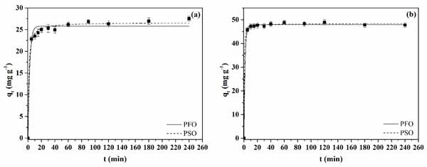 研究了初始吸附物濃度為50mgL-1和pH4的兩種活性炭的亮藍染料染料吸附動力學行為。作為時間函數(shù)的吸附容量曲線分別如圖3a、b所示,分別為活性炭1和2?梢杂^察到活性炭2獲得的曲線的特征在于更快的吸附速率;钚蕴2在大約10分鐘內(nèi)達到平衡。對于活性炭1,在大約60分鐘內(nèi)達到平衡。由于活性炭1呈現(xiàn)的較高總孔體積,可以解釋這種行為。高孔體積可以通過允許染料分子在孔內(nèi)更快地擴散到吸附位點來增強吸附動力學。