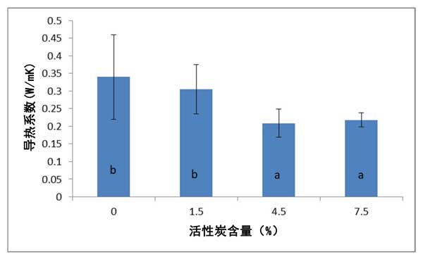 圖3:活性炭增強歐松板的導(dǎo)熱率值。圖3中的字母(a和b)表示具有同等重要性的樣本組聚集在一起。