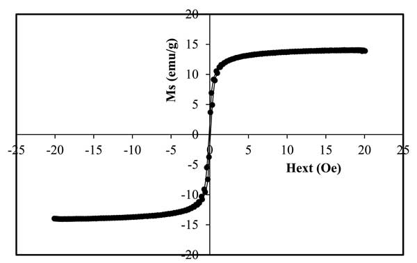 復(fù)合磁性材料的磁性測(cè)量顯示出室溫下的超順磁性。圖2顯示了在24.8℃溫度下測(cè)量的活性炭磁鐵礦材料的磁滯回線的存在。磁性活性炭的飽和磁化強(qiáng)度(Ms)值為14.06emu/g。磁性復(fù)合材料合成通常會(huì)降低純磁性材料的飽和磁化強(qiáng)度(Ms)值。