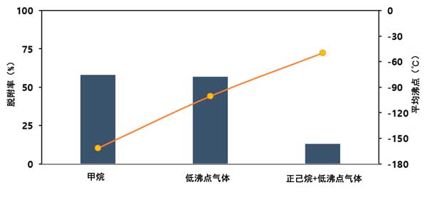 在本研究中的吸附劑中,果殼活性炭對四種低沸點THC氣體表現(xiàn)出最高的有效吸附能力。在現(xiàn)場條件下,使用低沸點和高沸點混合THC氣體。這里描述的實驗是在不同的進(jìn)料條件下進(jìn)行的,如下:(1)100ppm甲烷(bp-162℃),(2)100ppm低沸點THC(乙烯bp-103.7℃,乙烷bp)-89℃,丙烯沸點-47.6℃,丙烷沸點-42℃),以及混合THC,包括30ppm己烷(沸點69℃)和70ppm低沸點THC,在果殼活性炭下進(jìn)行100毫升/分鐘。如圖4所示,甲烷、低沸點THCs和混合THCs的有效吸附容量分別為0.0462mg/g、0.072mg/g和2.884mg/g。這些結(jié)果表明沸點與有效吸附容量成反比。
