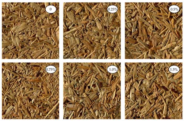 在UF樹脂中添加活性炭還可以改善刨花板的各種機械性能。研究表明,活性炭可以提高板材的尺寸穩(wěn)定性、強度和防水性。這在擔心潮濕暴露的應用中尤其有益。所生產(chǎn)的刨花板的外觀如圖2所示。添加高達1.5%活性炭沒有觀察到任何影響。相反,在碳含量較高的情況下,所得板材變暗并變灰。因此,在不影響材料美觀的情況下,這可以被視為較小負載的優(yōu)勢。