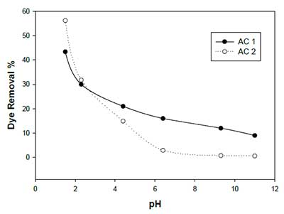考察了溶液酸度對(duì)活性炭對(duì)檸檬黃吸附的影響,初始pH范圍為1.5〜11.0,見圖1。吸附研究在37℃進(jìn)行。染料的典型pH值與百分比的去除在較高的pH值下顯示出染料百分比的顯著降低。觀察到pH值高于6.0的染料吸收的減少,此后觀察到吸附量沒有變化。對(duì)于AC1和AC2,在pH1.5分別達(dá)到染料的最大攝取(43.4和56.2%)。因此,選擇pH 1.5作為進(jìn)行后續(xù)研究的最佳值。該pH值也是人類胃的近似pH值。得到的結(jié)果表示因質(zhì)子化而增加中和吸附劑表面上的負(fù)電荷,這有利于擴(kuò)散并提供吸附劑的更多活性表面,由此在其表面處產(chǎn)生更大的吸附。溶液的pH控制吸附劑和被吸附物之間的靜電相互作用。隨著pH的增加,去除百分比的降低可能是由于去質(zhì)子化,這阻礙了吸附劑和山梨酸之間的靜電力,導(dǎo)致吸附能力降低。pH對(duì)AC吸附容量的影響與以前水溶液中吸收酒石黃的結(jié)果是一致的。
