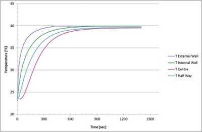 圖2、 當設備從環(huán)境條件轉移到40℃的水中時,床中和設備外表面上的溫度分布。
