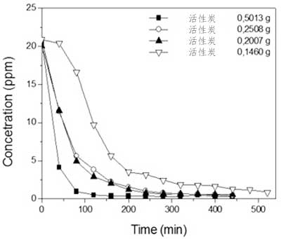 使用不同的質(zhì)量對活性炭的4-硝基酚吸附容量清楚地表明,在較低的質(zhì)量下,以mg g-1表示的吸附容量較高,盡管這是在較高的飽和時間獲得的。這偏離了預期,因為吸附容量應該標準化為每克吸附劑,因此應當獨立于所使用的吸附劑質(zhì)量。這個意想不到的結(jié)果主要是由于擴散問題,例如搖動,意味著當降低間歇系統(tǒng)中的擴散阻力時獲得更高的效率,導致4-硝基酚溶液更均勻的分布,同時溶液之間質(zhì)量增加的接觸減少和吸附劑。