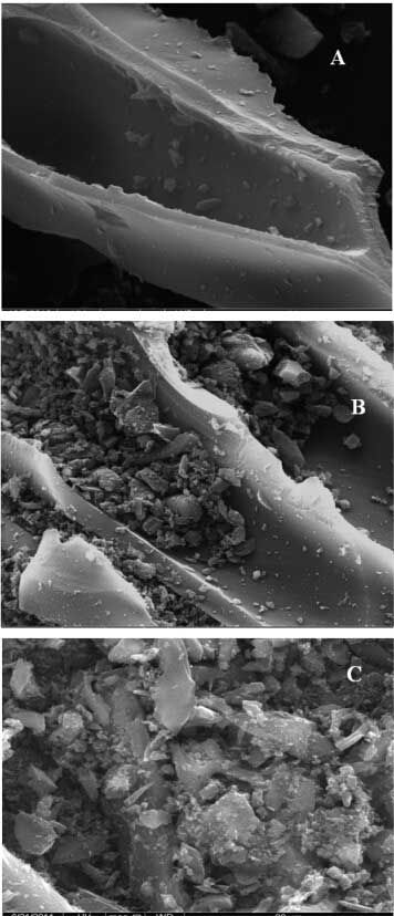圖2;钚蕴(A),改性活性炭(B)改性活性炭和PI(C)的SEM圖像(放大率= 5123×20μm)。