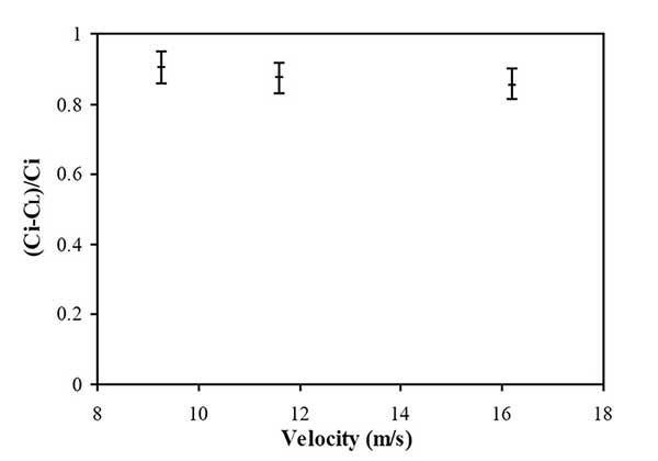 旋風(fēng)分離器系統(tǒng)對(duì)應(yīng)于具有強(qiáng)大的慣性力場(chǎng)的移動(dòng)床粒子。雖然活性炭尺寸和流速兩個(gè)參數(shù)在吸附過(guò)程中都起著關(guān)鍵作用,但顆粒尺寸有更明顯的趨勢(shì)。基于劇烈的湍流,高流速形成更好的混合條件,但使吸附劑顆粒的停留時(shí)間極短,這可能降低與旋風(fēng)分離器內(nèi)的目標(biāo)氣體流動(dòng)的接觸概率。例如,350升/分鐘(1pm)的流速導(dǎo)致16.2米/秒的入口速度,從而導(dǎo)致在旋風(fēng)分離器的混合室內(nèi)停留時(shí)間大約為0.14秒。因此,為了有效利用活性炭顆粒直至完全吸附,顆粒應(yīng)盡可能多次重復(fù)使用。