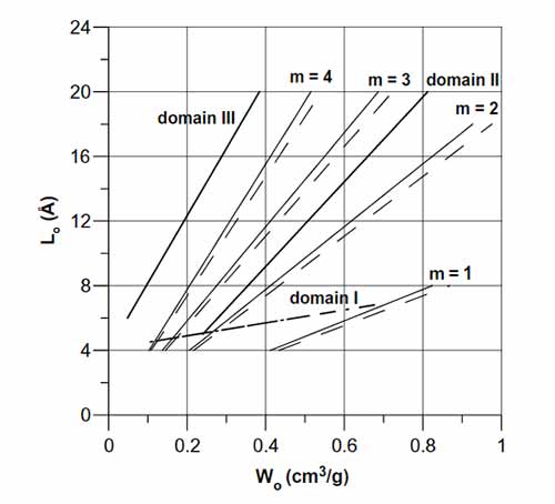 活性炭孔隙率遵循三個線性結(jié)構域所示的常見趨勢。這一事實表明存在著由不同前體和精制路線的固體部分共同形成的共同形態(tài)。根據(jù)這些多孔固體的近期和各種已發(fā)表的特征,它們的孔壁由基本結(jié)構單元的空間排列構成,所述基本結(jié)構單元由層疊的石墨烯層組成。為了減少模型中的參數(shù)數(shù)量,結(jié)構被描述為圓盤狀顆粒,其直徑的特征在于石墨烯層中涉及的苯環(huán)的數(shù)量,并且其厚度由堆疊層的數(shù)量和層間距離。用于工業(yè)宏觀尺寸盤狀顆粒堆積的可用經(jīng)驗相關性已經(jīng)應用于那些納米級結(jié)構,導致在chars和碳分子篩觀察到的實驗微孔體積范圍內(nèi)的值。