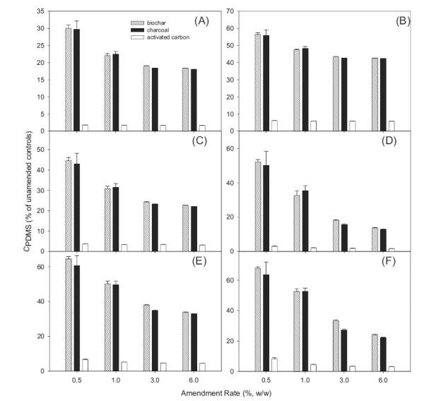 在平衡時(shí),通過活性炭吸附或隔離PBDEs反映了它們在PDMS纖維(C PDMS)上檢測到的水平的變化。在JL沉積物中,隨著活性炭修正,C PDMS顯著下降,并且活性炭的類型之間的減少不同(圖2)。例如,當(dāng)用生物炭以0.5%修正JL沉積物時(shí),C PDMS降低至未沉降沉積物中的水平的30.0-67.8%。木炭(29.7-63.5%)的效果與生物炭相似(圖2)。相比之下,活性炭修正沉積物中C PDMS的下降幅度更大(圖2))。例如,在含有0.5%活性炭的JL沉淀物中,對于不同的同源物,C PDMS降低至未改良處理的水平的1.8-8.1%。平均而言,添加1.0%的活性炭導(dǎo)致所選BDE同系物的C PDMS降低至對照水平的1.7-5.9%,這表明活性炭在沉積物中螯合PBDEs的能力遠(yuǎn)遠(yuǎn)高于其他黑碳材料。
