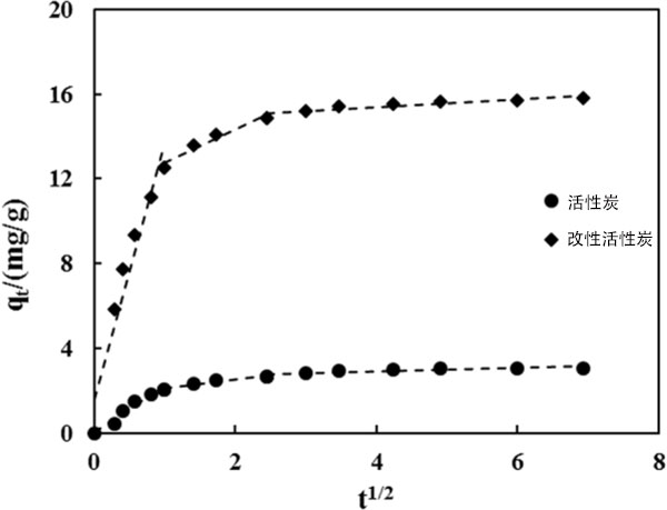 圖2:磺胺二甲嘧啶在活性炭上吸附的顆粒內(nèi)擴散結(jié)果。